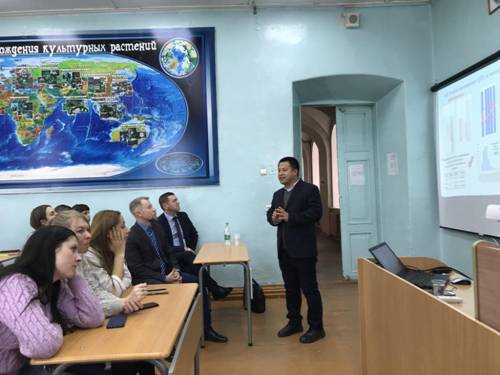 俄罗斯远东国立农业大学校长巴维尔,外事处处长弗拉基米尔,yl6809永利官网院长欧丽雅,科研处处长阿列克谢出席交流会,yl6809永利官网学生80余人参加了交流会。陈庆山院长作了题为《大豆全基因组导入系构建与应用》的学术报告,在报告中,陈庆山介绍了大豆分子育种的情况及其选育的新品种,他指出大豆是世界最重要的农作物之一,是植物蛋白质和油分重要来源,在中国需求量很大。报告结束后,老师和同学们提出了感兴趣的问题,与陈庆山进行了充分交流。
