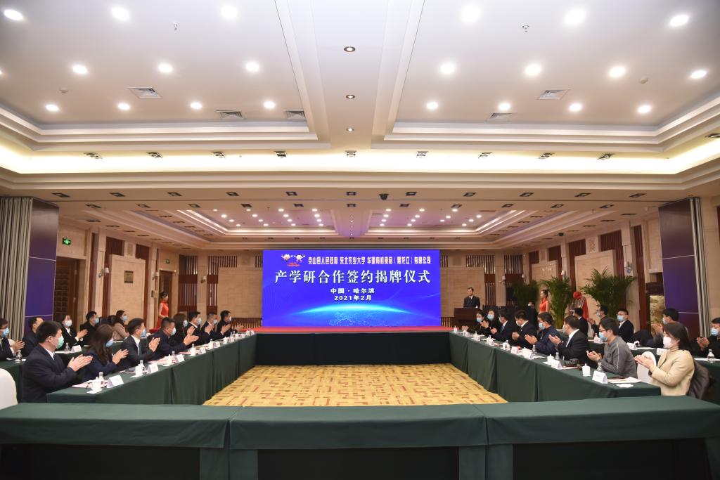 签约仪式上,我校与克山县人民政府、华源有机食品(黑龙江)有限公司签订了《“县校企”合作框架协议》,与华源公司签订了《技术开发(委托)合同》以及《技术转让(专利权)合同》等协议。刘竹青、韩大勇、陈庆山、吴章祝共同为“东农华源大豆产业技术创新中心”揭牌。根据协议内容,三方将重点在大豆产业规划、品种研发、种子生产、食品研发等多个层面开展全方位战略合作,标志着我校无腥味大豆系列科研成果成功落地转化,在大力发展农业农村现代化的新时期新要求下,围绕无腥味大豆的育种、种植、深加工等全产业链内容,探索校县企合作的新模式,开启功能性大豆产业发展的新征程。