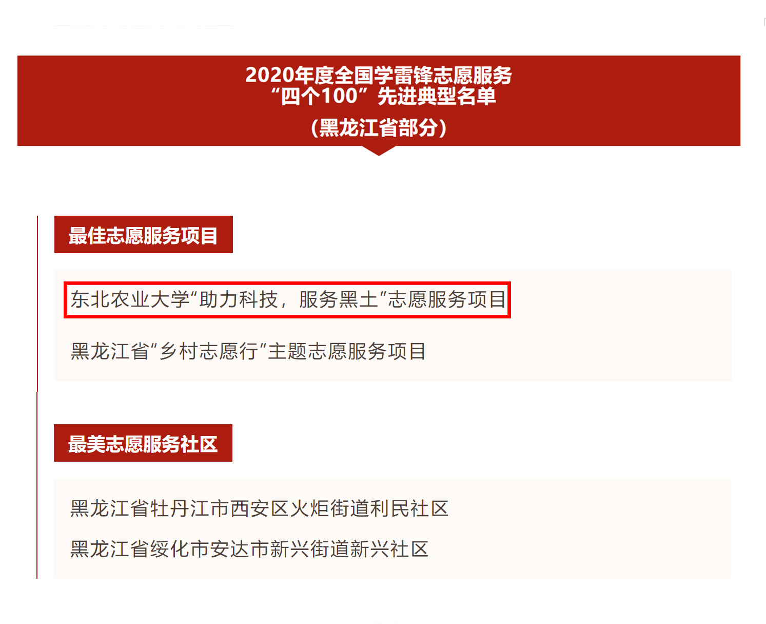近日,中央宣传部、中央文明办等部门和单位共同组织开展了2020年度全国学雷锋志愿服务“四个100”先进典型宣传推选活动。我校yl6809永利官网“助力科技,服务黑土”志愿服务项目被评为全国学雷锋志愿服务先进典型“最佳志愿服务项目”,是我省高校唯一一个入选的志愿服务项目。
