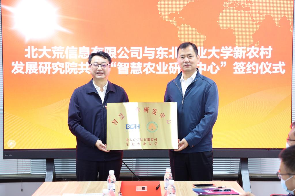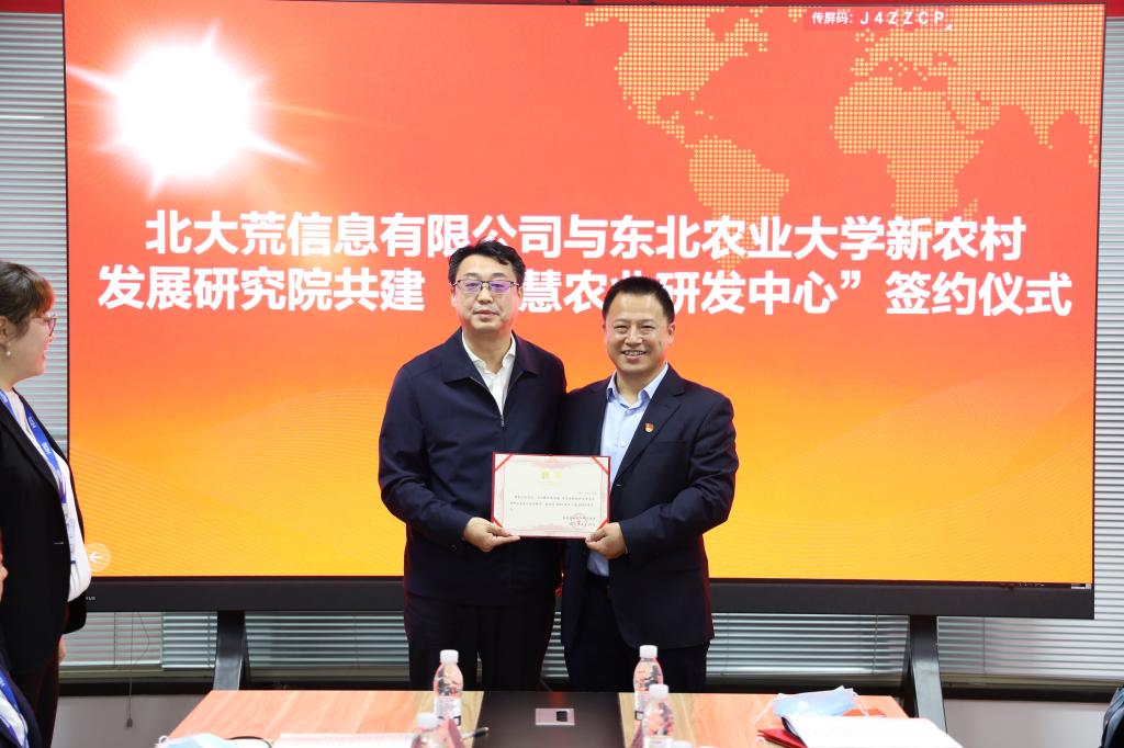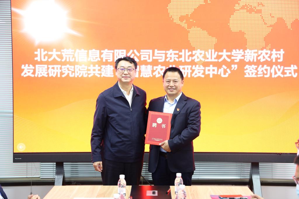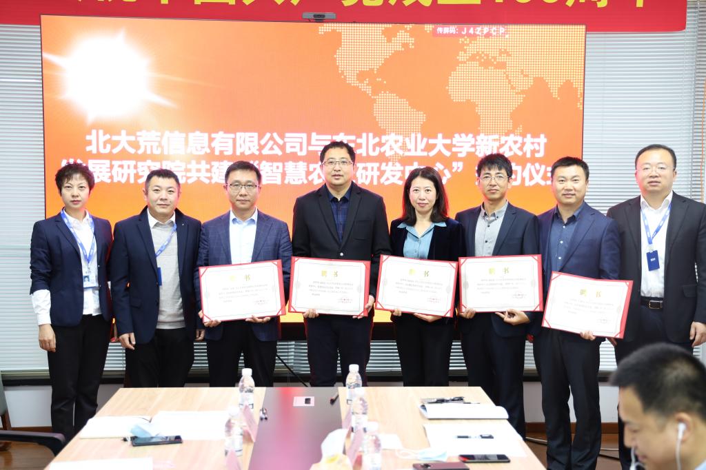 第二,针对“研发中心”,yl6809永利官网陈庆山院长与北大荒信息有限公司任荣荣副总经理就“研发中心”签订合作协议,东北农业大学新农村发展研究院朱志猛院长与北大荒信息有限公司张允海董事长为“研发中心”揭牌。张允海董事长为陈庆山院长颁发首席专家聘书,副总经理兰天义、罗广超两位副总经理和纪委书记徐洪波为东北农业大学智慧农业教师颁发聘书。