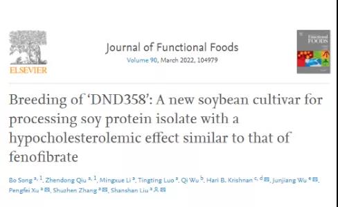近日,《Journal of Functional Food》在线发表了来自东北农业大学大豆生物学教育部重点实验室刘珊珊教授团体和张淑珍教授团队合作的题为‘Breeding of ‘DND358’:A new soybean cultivar for processing soy protein isolate with a hypocholesterolmic effect similar to that of fenofibrate’的研究论文。