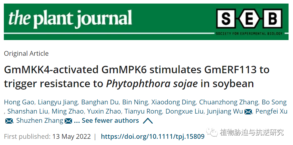 5月13日,国际著名期刊The Plant Journal(JCR - Q1,IF=6.417)在线发表了东北农业大学张淑珍教授团队完成的题为“GmMKK4-activated GmMPK6 stimulates GmERF113 to trigger resistance to Phytophthora sojae in soybean”的研究论文。该研究揭示了GmMKK4 - GmMPK6 - GmERF113级联介导的大豆疫霉根腐病的抗性机制,为阐明植物抗病策略和深入了解MAPK级联途径参与大豆疫霉根腐病和茎腐病的防治提供了线索。